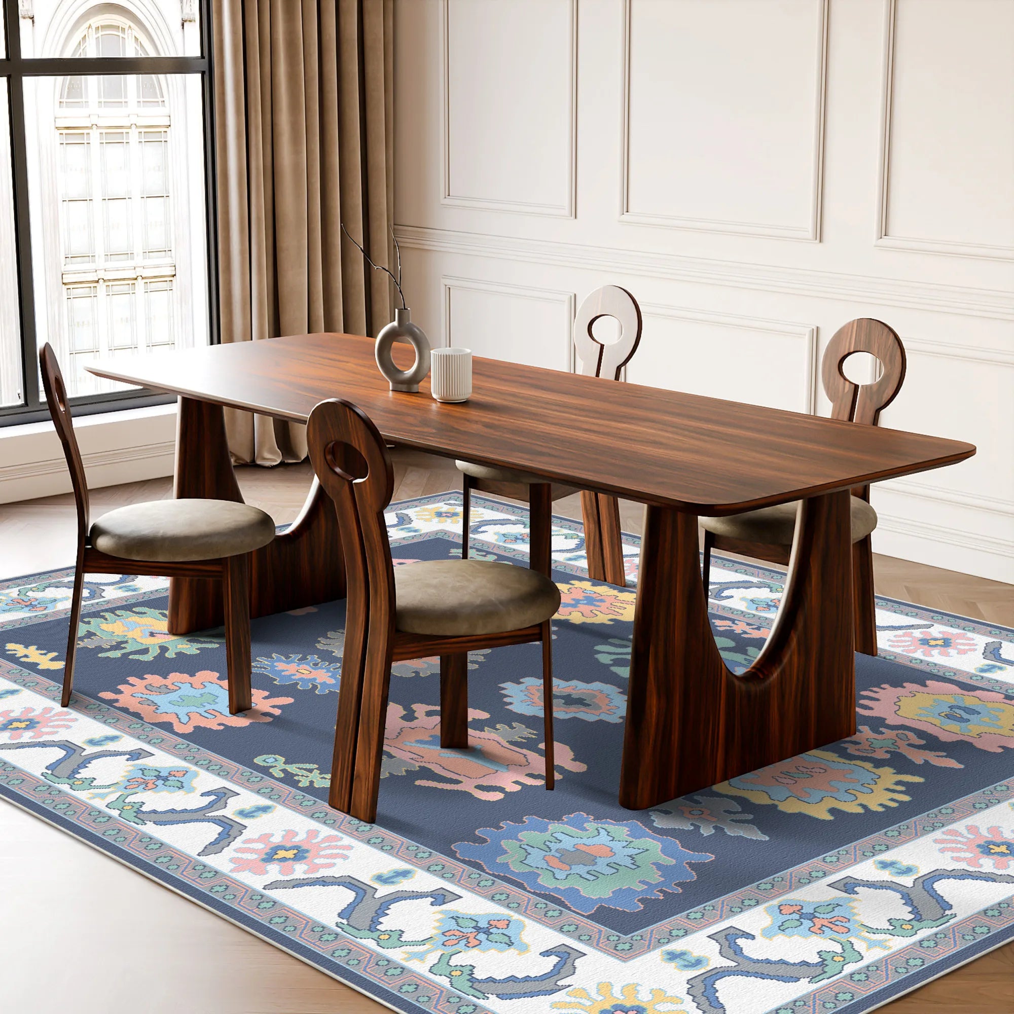 Beyond its bold visual appeal, the Aura Indigo Pop is engineered for the fast-paced demands of a modern home. We have woven this rug from premium, high-density polyester fibers that deliver a velvety, ultra-soft touch underfoot while maintaining exceptional durability against high foot traffic. The saturated indigo base is highly practical for busy households, while our advanced color-lock technology ensures the neon-pastel motifs stay brilliant and crisp. Supporting this artistic expression is a high-grade, slip-resistant backing that keeps the rug perfectly in place on any surface. Fully machine washable and robot-vacuum friendly, it offers a worry-free foundation for a home that isn't afraid to stand out.