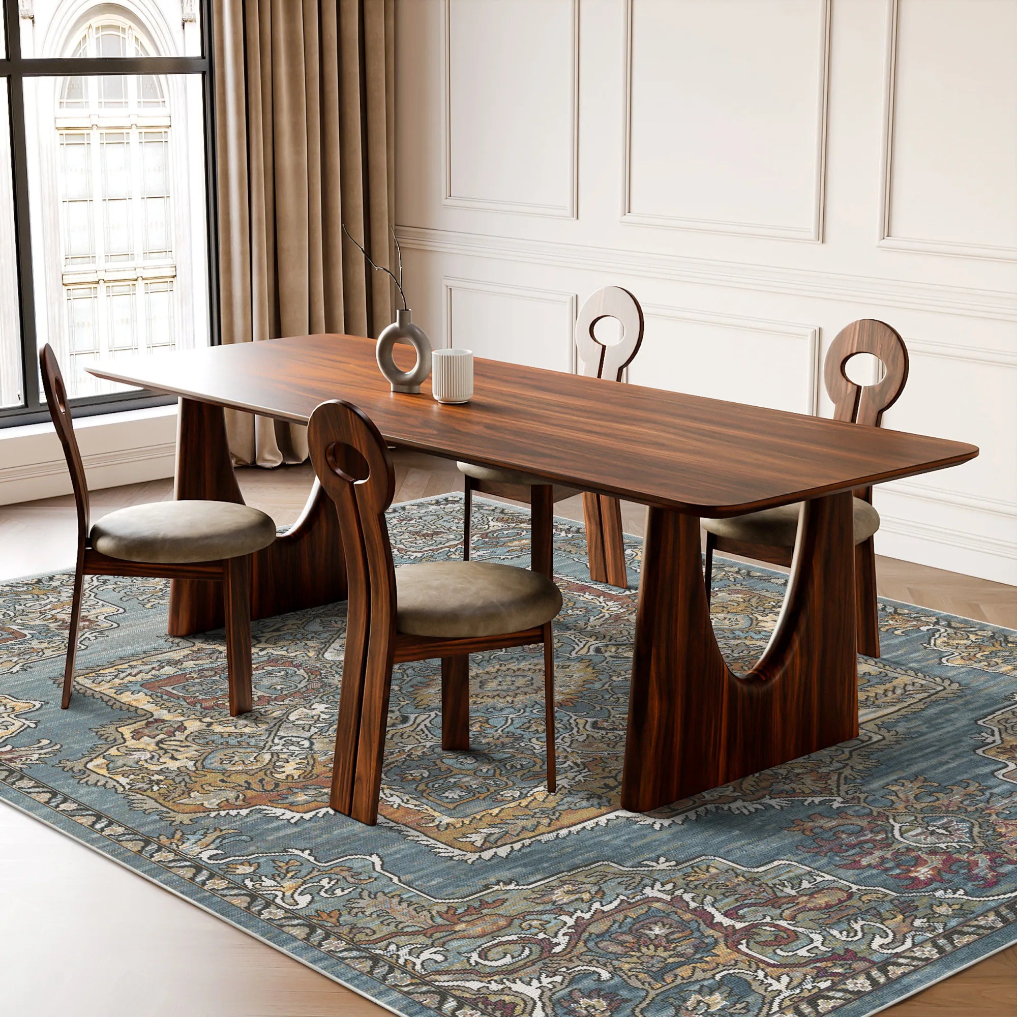 Step into a realm of timeless majesty and intricate artistry with the Bukhara Slate Traditional Washable Rug. Inspired by the legendary textile heritage and sun-drenched architectural wonders of Central Asia, this design serves as a breathtaking centerpiece for any home. The rug features a monumental stepped medallion that expands across the field, surrounded by an exceptionally detailed botanical border. A sophisticated palette of slate blue, burnt amber, and warm terracotta is masterfully woven with accents of antique gold and cream. The beautifully distressed texture creates a layered visual depth, giving the piece the soul of a rare museum-quality heirloom that has been softened by centuries of history. It is a sublime choice for a grand living room, a formal dining hall, or an executive study that demands an atmosphere of wisdom, power, and serene beauty.