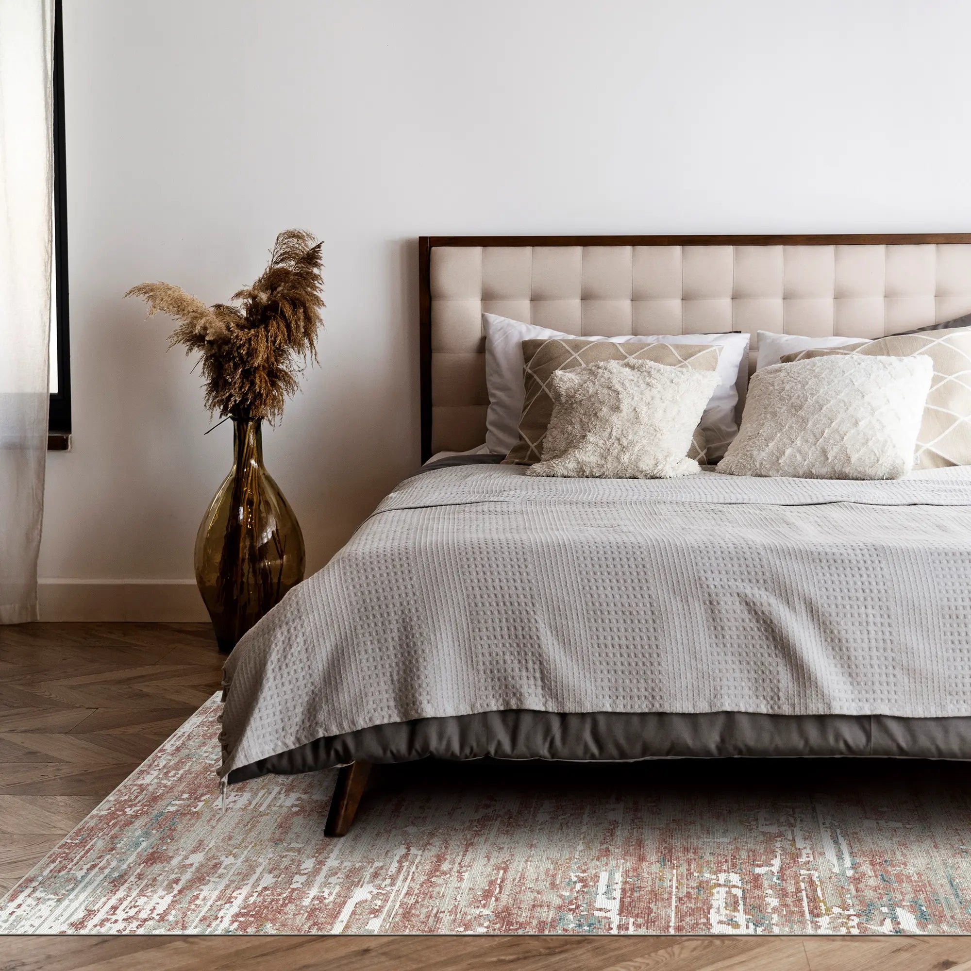 Transform your living space into a warm sanctuary with the Canyon Ember Washable Abstract Rug. This design draws inspiration from the natural oxidation of desert landscapes, featuring horizontal striations of burnt terracotta, rustic copper, and soft clay. These fiery tones are artfully balanced by a creamy ivory base, while subtle, "ghostly" whispers of teal and slate blue provide a sophisticated contrast. The heavy, weathered texture gives the piece a gallery-worthy, "aged-to-perfection" look that complements both rustic-chic interiors and sleek modern lofts.