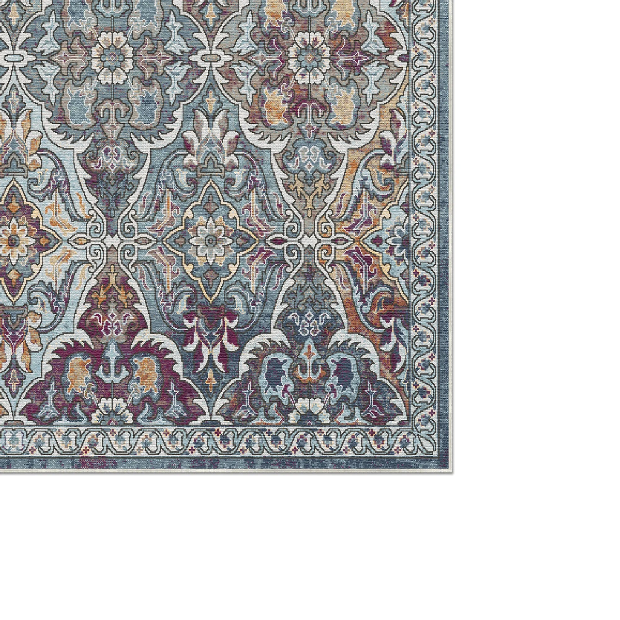 Cool down your space with the serene elegance and intricate beauty of the Celeste Slate Arabesque Washable Rug. Departing from traditional central medallions, this captivating design features a mesmerizing, all-over interlocking arabesque and ogee pattern that draws the eye across the entire room. The rug boasts a beautifully muted, cool-toned tapestry of colors, masterfully blending faded slate blue, soft gray, and muted teal against an antique ivory base, subtly punctuated by unexpected jewel-toned accents of deep plum and golden amber. With its intentionally distressed finish, this piece mimics the soulful charm of a treasured antique, making it a peerless choice for a serene bedroom, a refined coastal living room, or an elegant dining area that demands a sophisticated, calming focal point.