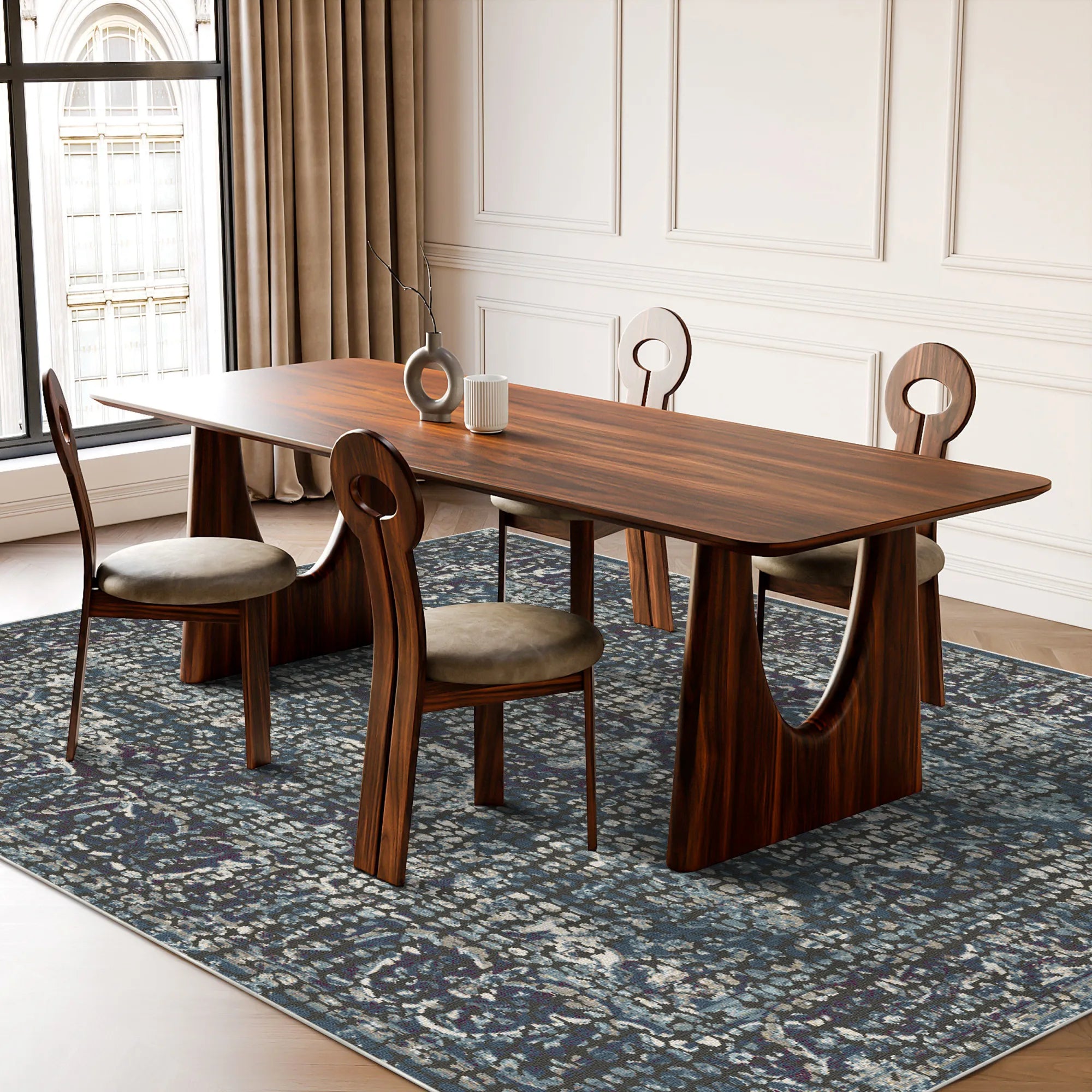 Masterfully engineered to marry this intricate pointillist aesthetic with the rigorous demands of modern household life, the Celestial Frost Pointillist is woven from premium, high-density polyester fibers. This construction delivers a velvety, cloud-like touch underfoot while offering superior resilience against daily foot traffic. Our advanced color-lock technology ensures that the deep indigo tones and icy ivory gradients remain beautifully crisp, wash after wash. For ultimate peace of mind, it features a high-grade, integrated slip-resistant backing that grips firmly to your hardwood or tile floors, ensuring the rug remains perfectly flat and secure without the need for additional pads. Fully machine washable and optimized for robot vacuum compatibility, this rug brings the timeless allure of a star-dusted masterpiece into your home with zero maintenance stress.