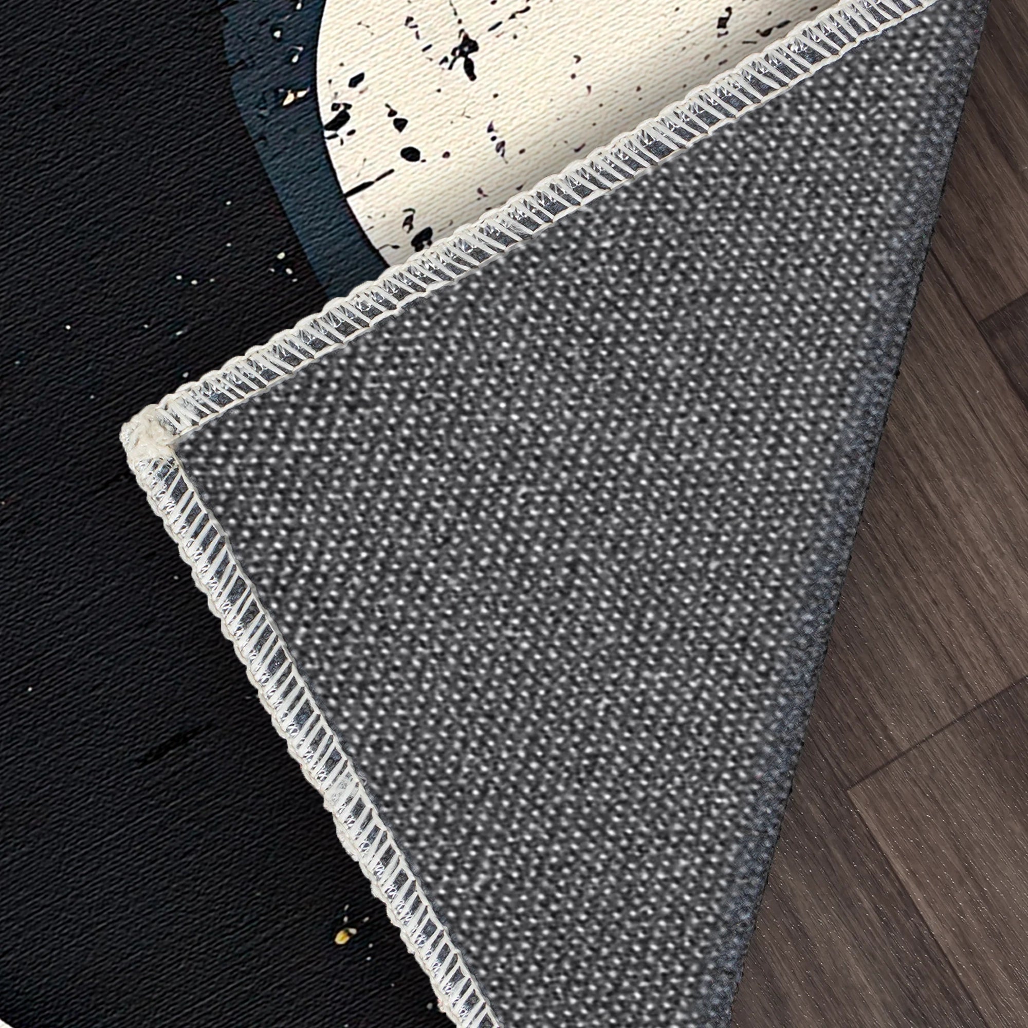 Masterfully engineered for high-performance demands, this rug utilizes state-of-the-art digital printing technology to render its sharp contours, saturated colors, and subtle "ink-splatter" textures with high-definition clarity. The surface is crafted from premium polyester fibers, providing a silky-soft underfoot experience and a matte finish that lets the graphic pattern lead. It is supported by a natural cotton base, offering an eco-friendly, breathable, and stable foundation. Designed for maximum convenience, this rug is fully machine washable, ensuring its vivid, multi-tonal look remains fresh and bold.