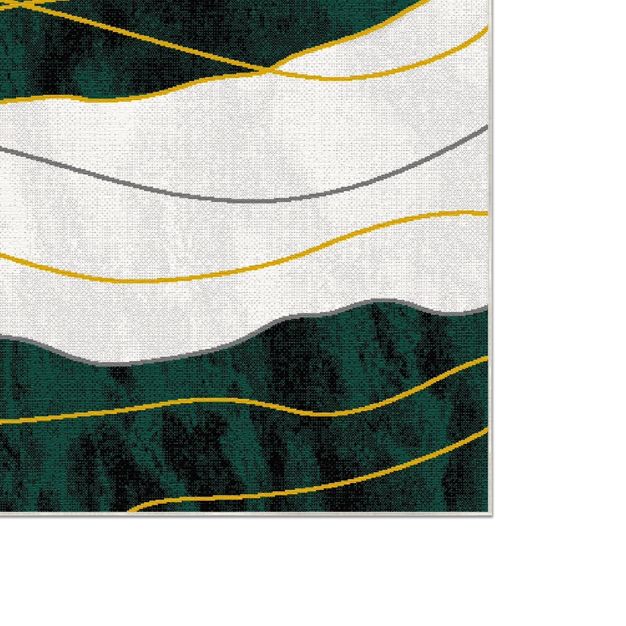 Transform your living space into a serene sanctuary with the Emerald Horizon Fluid Abstract Rug. This breathtaking design features sweeping, organic waves of deep emerald and forest green set against a crisp white and soft gray backdrop. Interlaced throughout the composition are delicate, flowing lines of shimmering gold and silver, mimicking the natural elegance of marble veins or a rolling landscape at twilight. Its sophisticated balance of bold jewel tones and airy neutrals makes it an ideal centerpiece for contemporary living rooms, luxury bedrooms, or modern organic-themed interiors.