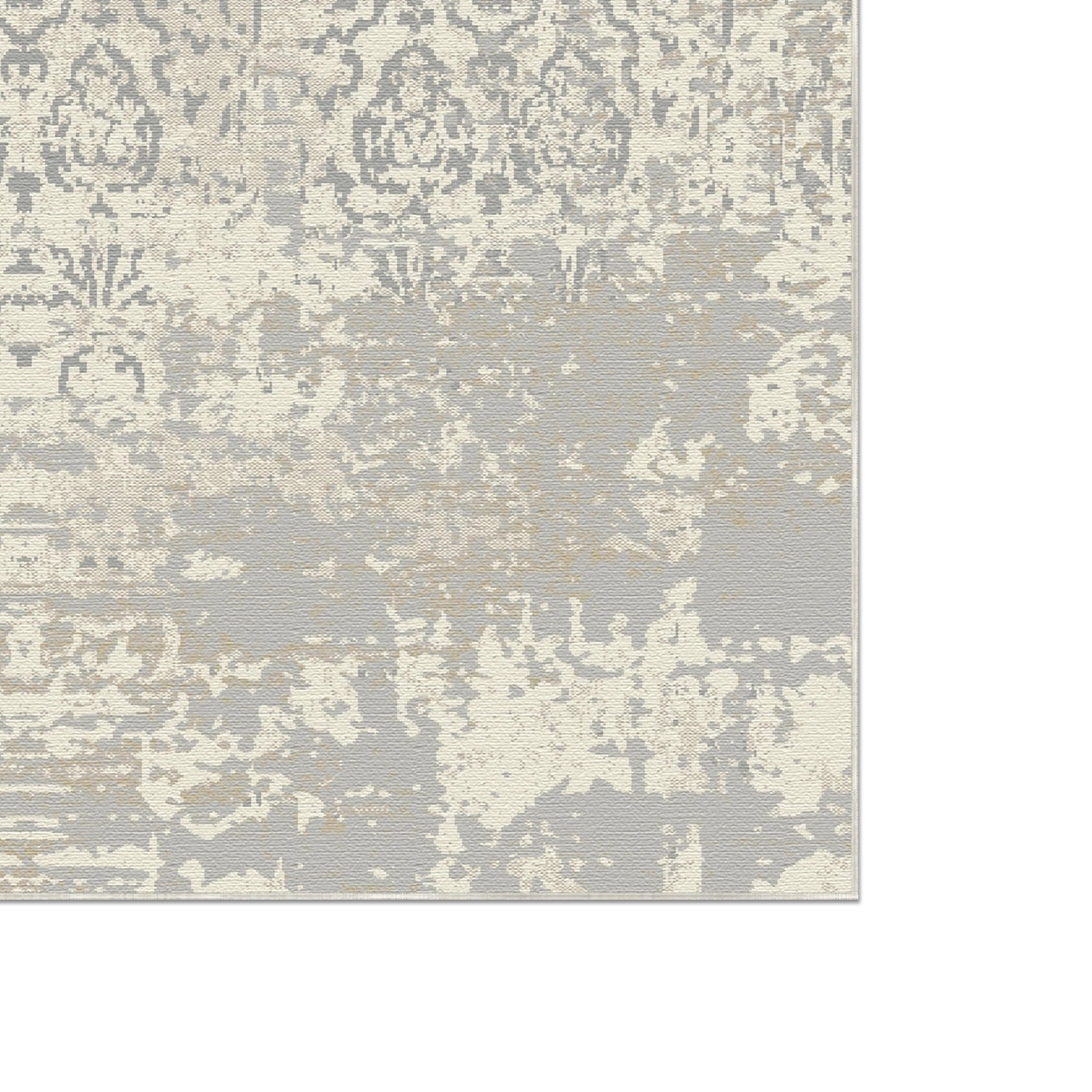 The Faded Vintage Damask Distressed Rug brings a touch of timeless elegance and antique charm to any space. This rug features a classic ornamental damask pattern, including a central medallion and intricate border, that has been heavily distressed to create a soft, worn, and almost ghostly appearance. The muted color palette of soft grey, light beige, and creamy off-white makes it a versatile piece that blends seamlessly with a variety of decor styles. It's perfect for adding a sophisticated, shabby-chic feel to a living room, bedroom, or dining area.