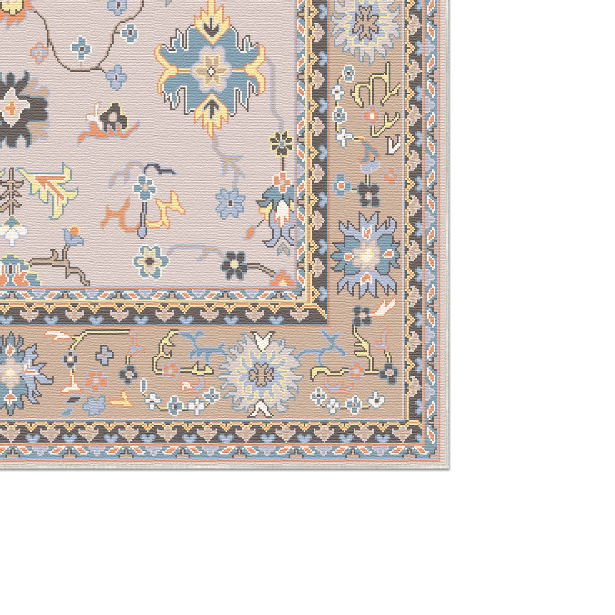 Transform your sanctuary into a space of poetic calm with the Iris Misty Meadow Washable Rug. This design is a masterclass in modern-vintage fusion, featuring a sophisticated "floating" botanical arrangement that moves away from heavy central anchors. The field is a serene, multi-tonal pale vizon, providing a light-filled and airy foundation for the high-definition floral sprays rendered in misty teal, burnt apricot, and soft indigo. Each stem and petal is captured with artisan-like precision, creating a visual narrative that mimics a sun-drenched meadow at dawn. Framed by a double-layered ornamental border with a delicate "beaded" guard system, this rug offers a masterful balance between romantic heritage and contemporary minimalism, making it a peerless choice for a modern nursery, a serene primary suite, or a light-filled open-plan living room.