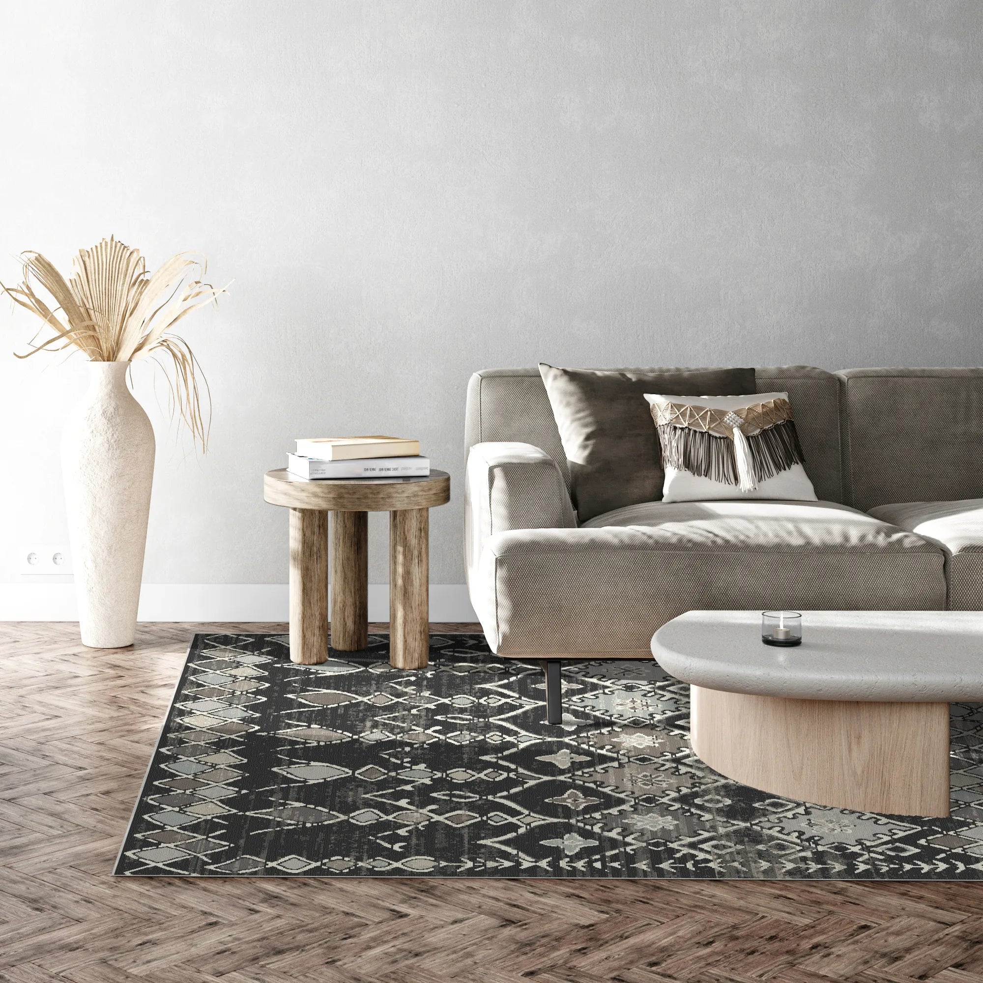 Make a bold statement with the dramatic depth of the Mayan Night Tribal Washable Rug. This striking variation from our Ethnic Collection reimagines the intricate tribal pattern in a moody, sophisticated palette. The deep charcoal and black background serves as a powerful canvas for the stylized diamond and arrow motifs, which are rendered in contrasting shades of light gray, stone beige, and muted slate blue. The distressed finish enhances the rug's artisanal character, making it a perfect anchor for modern industrial lofts, masculine dens, or bohemian spaces that crave a touch of dark elegance.