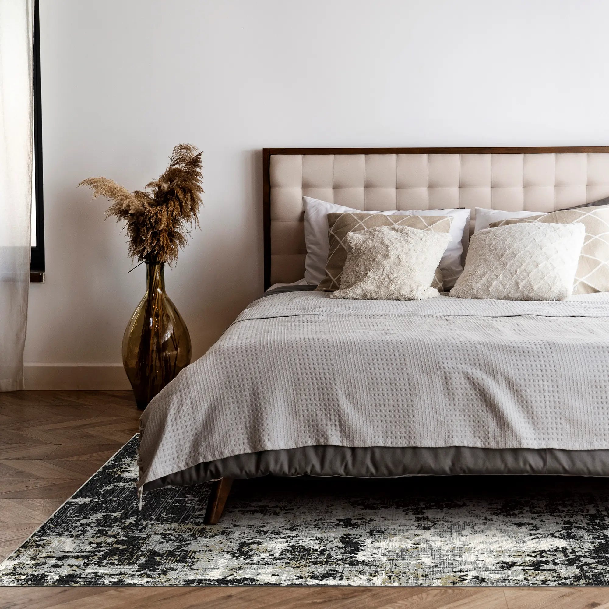 Make a powerful and luxurious statement with the Midnight Onyx Gold Abstract Rug. This piece is the pinnacle of the series, featuring a high-contrast, dramatic design that pairs deep obsidian black with striking gold and champagne accents. The weathered, marble-like texture is softened by expansive areas of creamy off-white, creating a sophisticated visual balance that commands attention. It is the perfect choice for creating an atmosphere of "modern mystery" and high-end elegance in master bedrooms, executive offices, or formal living rooms.