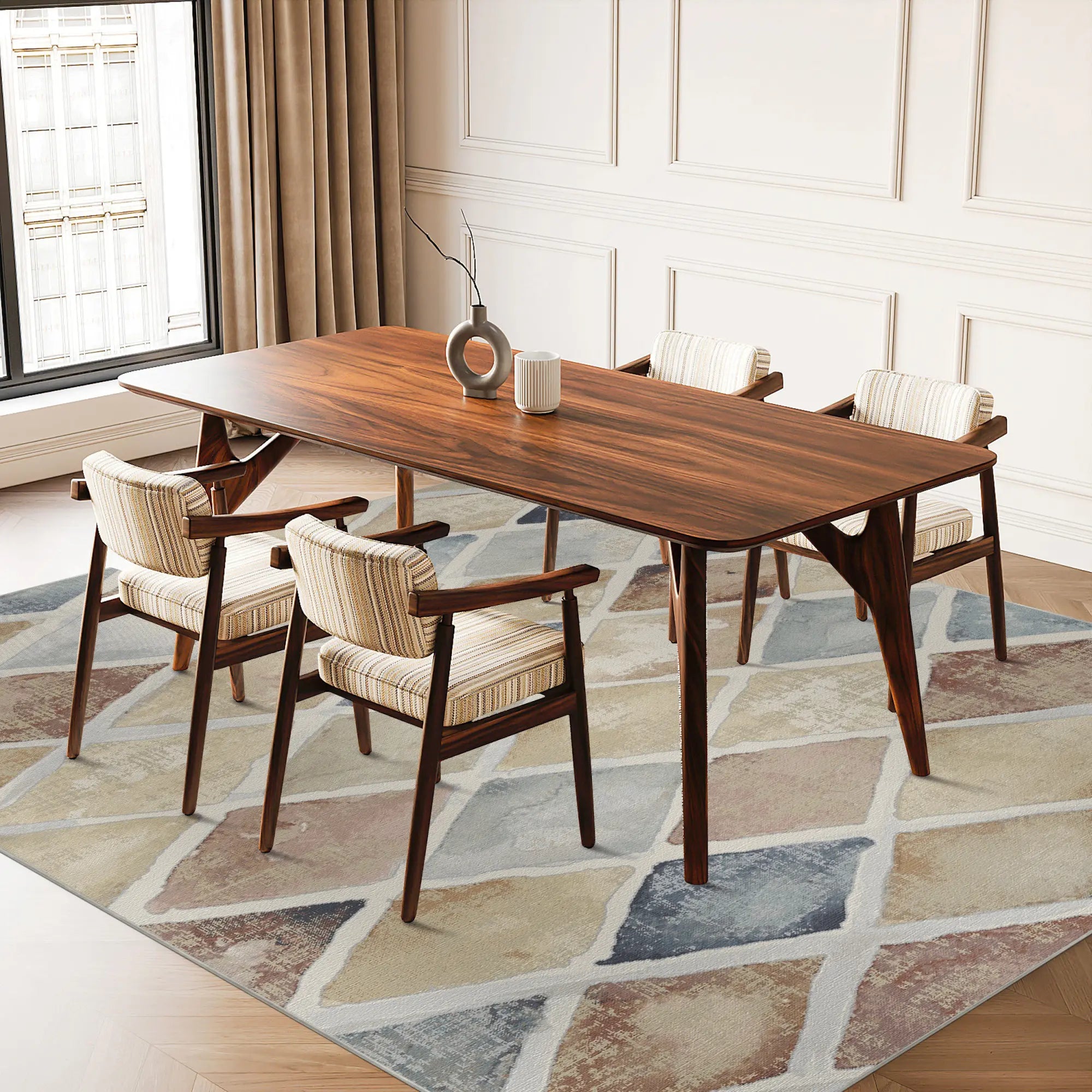 The Mosaic Drift Watercolor Harlequin Rug reimagines a classic geometric pattern with a soft, artistic soul. This design features a structured diamond grid where each pane is filled with unique, painterly washes of denim blue, warm terracotta, and sandy ochre. The watercolor effect creates beautiful transparency and movement, while the off-white "grout" lines provide a clean, modern frame. It is an exceptional choice for cozy living rooms, creative nurseries, or eclectic dining spaces that need a splash of sophisticated, multi-tonal color.