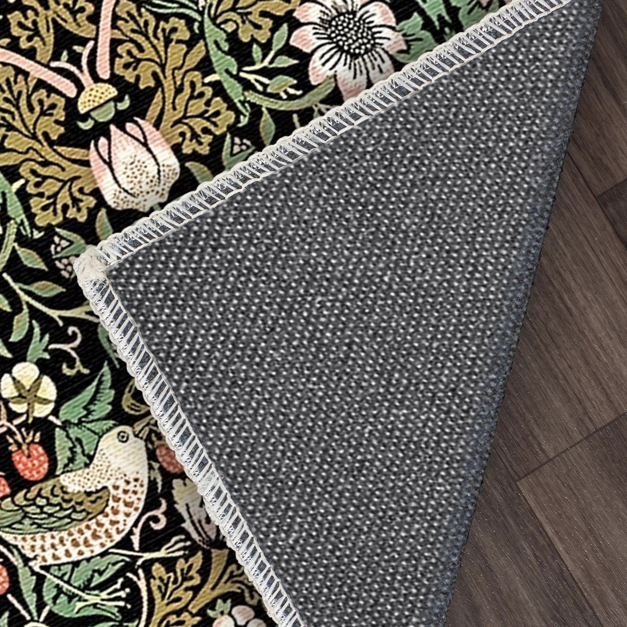 Step into a world of timeless artistry with our Obsidian Heritage Bird Rug. This design is a stunning tribute to the legendary Arts and Crafts movement, featuring a sophisticated and symmetrical pattern of songbirds, ripe strawberries, and flowering vines. Set against a deep, dramatic black background, the rich forest green foliage and delicate pink accents create a powerful visual contrast that anchors any room with a sense of history and maximalist luxury.