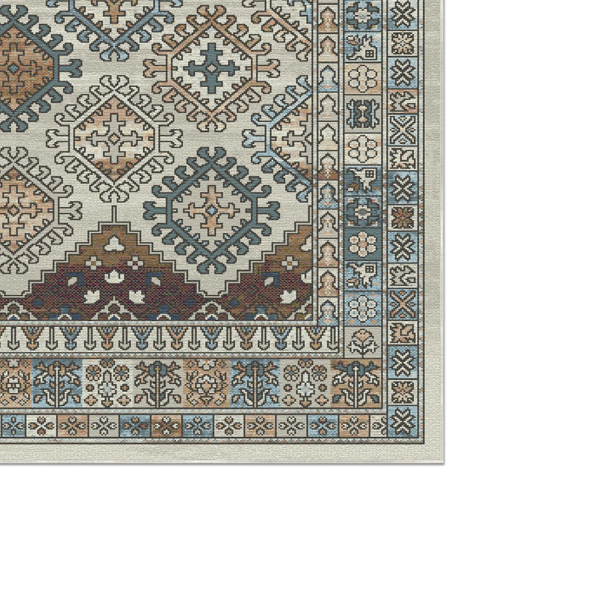 Experience a luminous fusion of ancient structure and modern serenity with the Palmyra Ivory Tribal Washable Rug. Inspired by the sun-drenched ruins and the delicate stone carvings of historic desert oases this design offers a refreshing interpretation of classical kabile geometry. The rug features a rhythmic field of stepped medallions rendered in a sophisticated palette of caramel gold slate blue and rustic cinnamon against a clean ivory and pearl white background. A beautifully weathered finish softens the earthy tones giving the piece the authentic character of a rare textile heirloom that has been preserved in a bright open gallery. It is an exquisite choice for a minimalist master suite a bright Scandinavian living room or a tranquil home office that seeks to combine historical depth with a light and airy aesthetic.