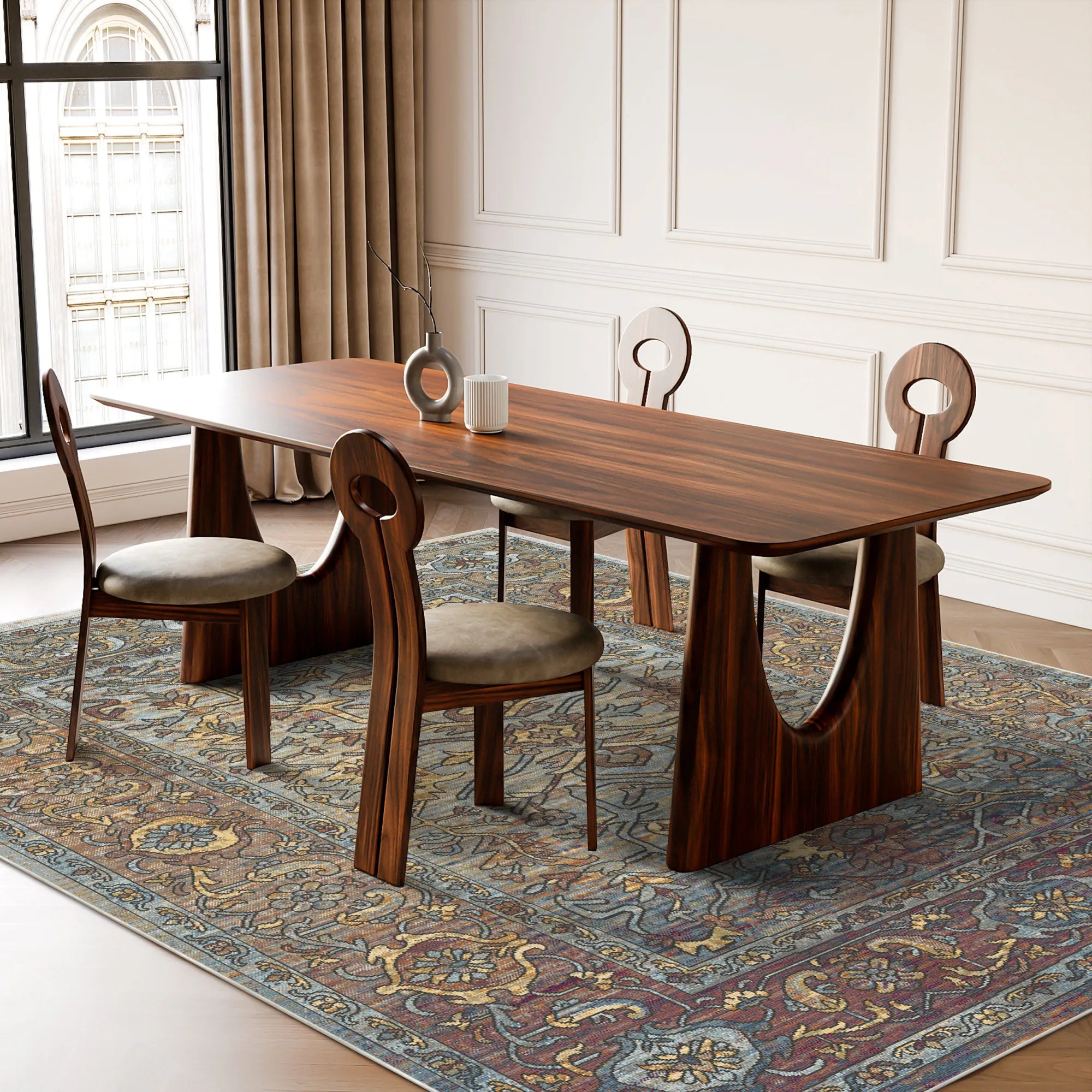 Immerse your home in the storied elegance of the Silk Road with the Samarkand Blue Traditional Washable Rug. Inspired by the majestic tilework and ancient gardens of Central Asia this design is a masterful bridge between classical botanical art and modern distressed aesthetics. The rug features a sophisticated "Tree of Life" motif branching out across a luminous wash of slate blue and sun bleached sand. Accents of deep burgundy mustard gold and rustic copper bloom through the weathered texture creating a layered visual depth that resembles a priceless antique heirloom. It is an impeccable choice for a refined dining room a serene master bedroom or a curated living space that seeks to blend historical grandeur with a peaceful contemporary soul.