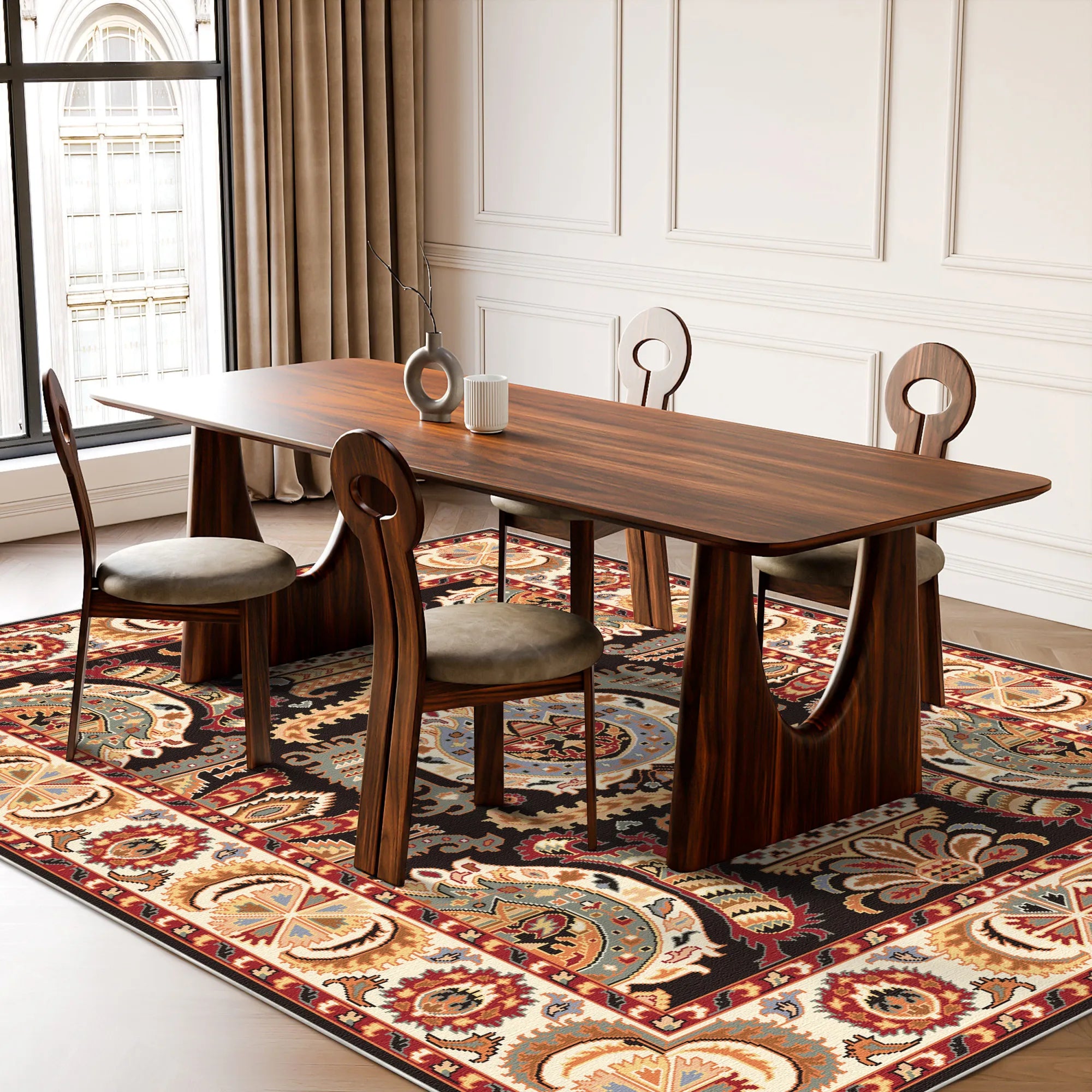 Command the visual narrative of your interior with the dramatic and storied presence of the Selene Obsidian Totem Washable Rug. This design is a captivating exploration of ancient symbolism and high-contrast artistry, featuring a central axis of floating "totem" medallions and stylized botanical guardians. The field is a deep, velvety obsidian black, providing a bold and mysterious foundation for the intricate high-definition details rendered in warm amber, spicy cinnamon, and ethereal sky blue. Framed by a grand, ivory-based border filled with radiating sun-disc motifs and floral guards, this rug creates a powerful architectural frame that grounds any room with a sense of historical authority and modern edge. It is a peerless choice for a contemporary industrial loft, a bold maximalist living room, or a private gallery space that seeks a centerpiece with soul and substance.