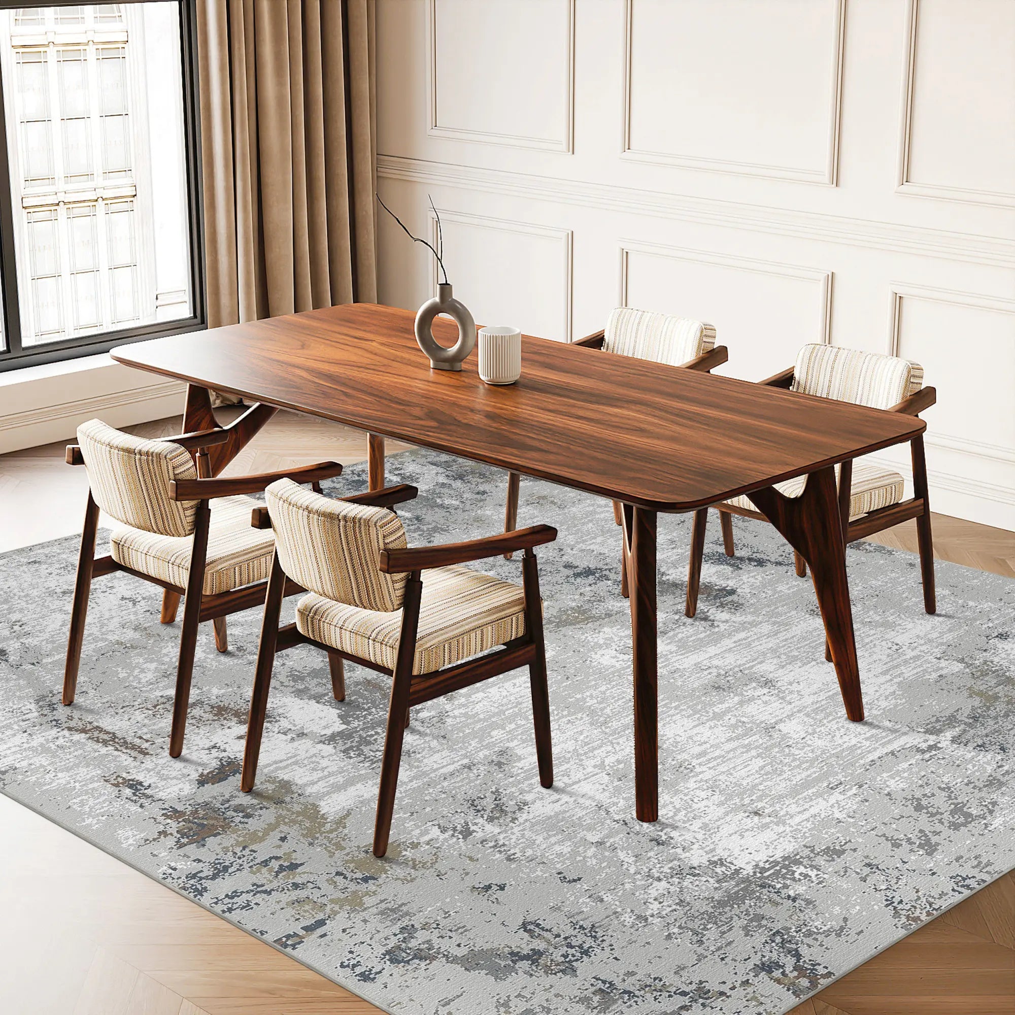 Engineered to combine high-end aesthetics with the realities of a busy home, this rug is produced using high-definition digital printing technology. This ensures that the intricate "weathered" textures and subtle color bleeds are captured with gallery-like precision. The surface is crafted from premium polyester fibers, offering a velvet-soft touch and a subtle sheen that shifts beautifully under different lighting conditions. It is built on a natural cotton base, providing a stable, eco-friendly, and breathable foundation for any room. Designed for ultimate practicality, this rug is fully machine washable, allowing you to maintain its sophisticated, artistic look without the hassle of professional cleaning.