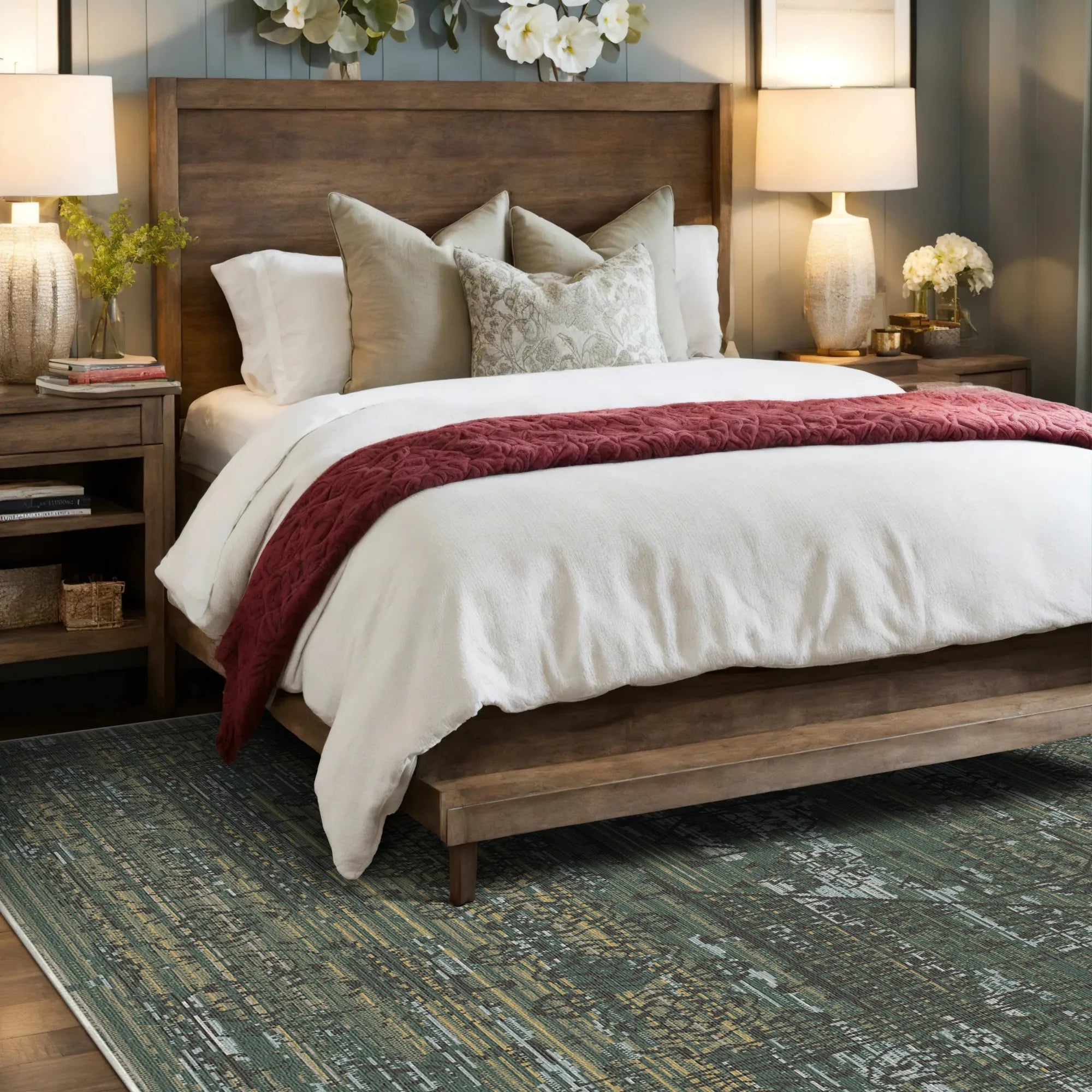 Invite the calming essence of an ancient forest floor into your home with the Solstice Sage Geometric Washable Rug. This design offers a serene and organic interpretation of classical geometry, featuring a ghostly, faded central medallion and meticulously detailed linear borders. The palette is a sophisticated exploration of earthy tones, blending muted sage green and deep moss with subtle highlights of golden mustard and charcoal gray. Heavily distressed with deep horizontal striations, the pattern appears like a weathered architectural relic reclaimed by nature. It is a peerless choice for creating a tranquil atmosphere in a contemporary bedroom, a refined home office, or a modern organic living area that seeks a balance of structure and softness.
