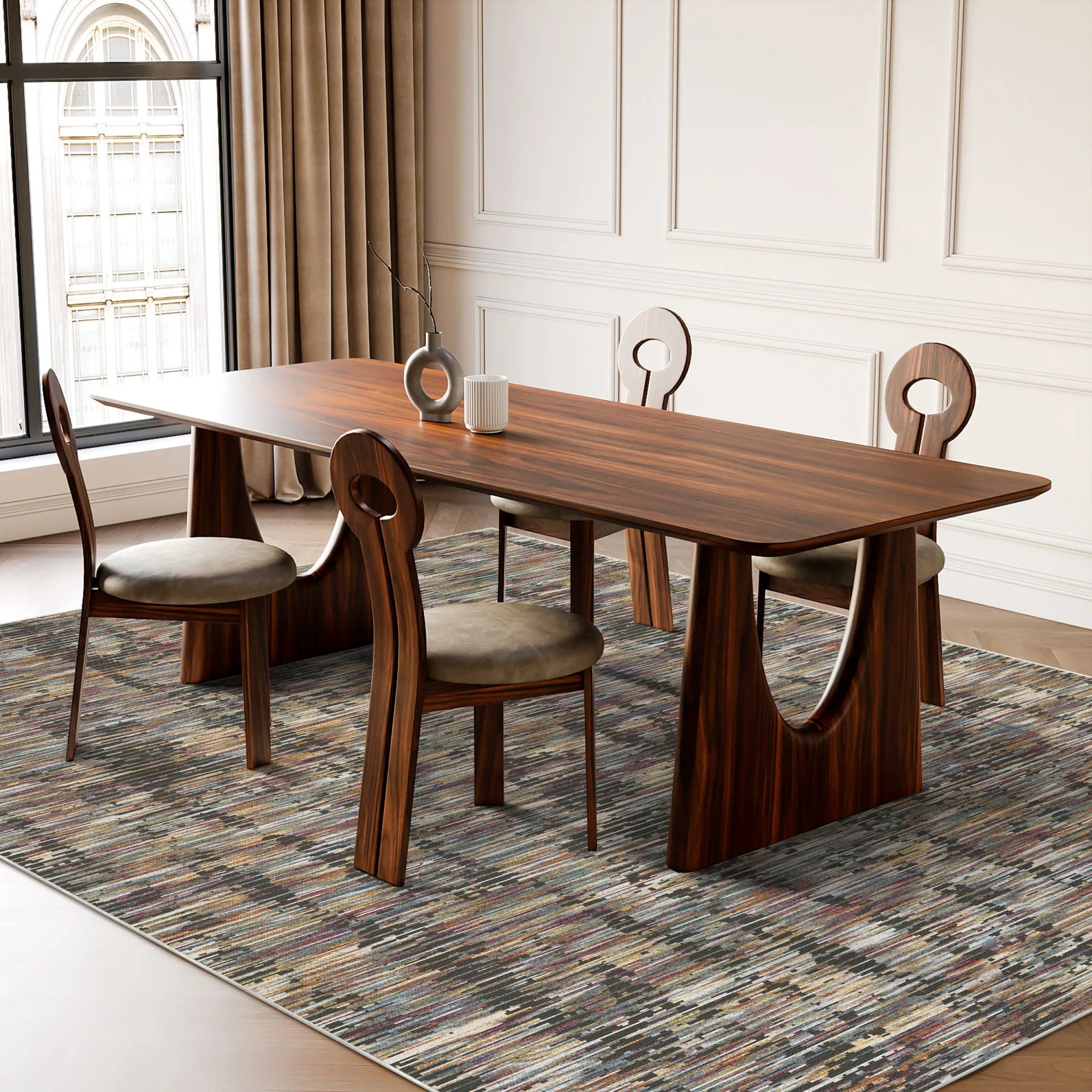 Masterfully engineered to marry this breathtaking "glitch-art" aesthetic with the rigorous demands of modern household life, the Spectral Horizon Abstract is woven from premium, high-density polyester fibers. This construction delivers a velvety, cloud-like touch underfoot while offering superior resilience against daily foot traffic. Our advanced color-lock technology ensures that the deep obsidian grays and vibrant jewel-toned highlights remain beautifully saturated, wash after wash. For ultimate peace of mind, it features a high-grade, integrated slip-resistant backing that grips firmly to your hardwood or tile floors, ensuring the rug remains perfectly flat and secure without the need for additional pads. Fully machine washable and optimized for robot vacuum compatibility, this rug brings the timeless allure of a weathered, modern masterpiece into your home with zero maintenance stress.