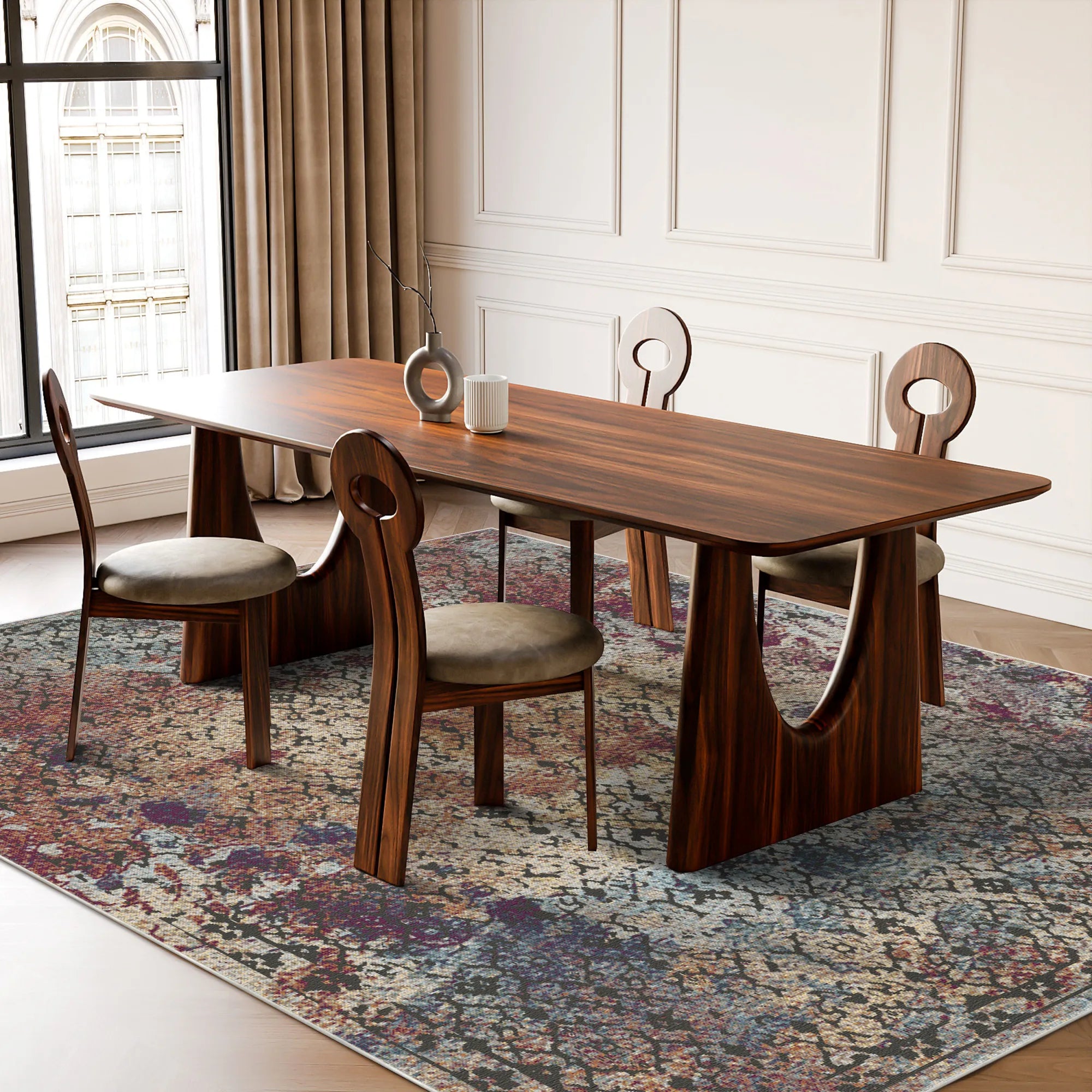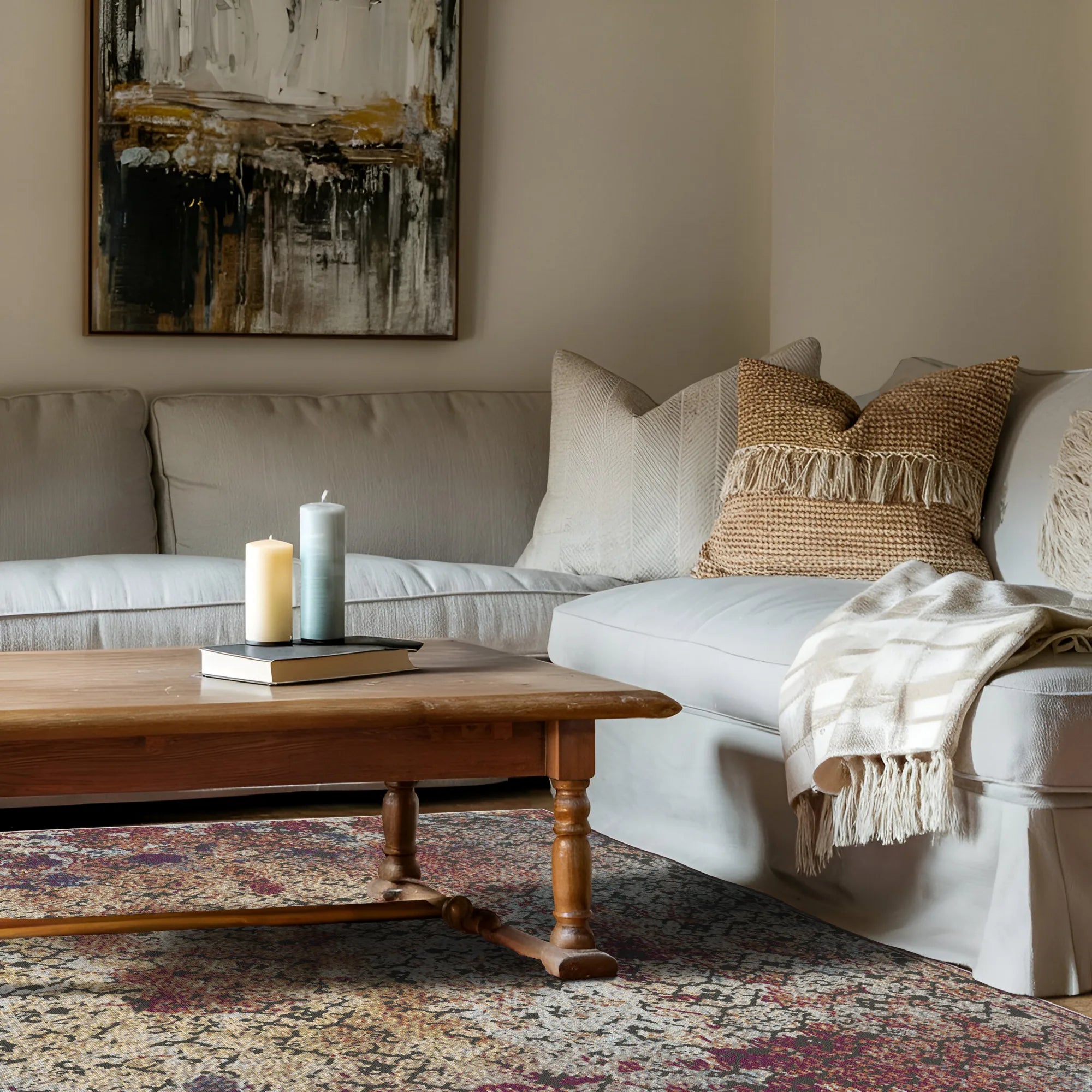 Vivi l’emozionante fusione tra geometria strutturata ed espressionismo astratto con il Tappeto Lavabile Artisan Inkwell Lattice. Questo design prende una tradizionale struttura a rombi e la reinterpreta come una tela da pittore, con drammatiche macchie "a inchiostro" che si diffondono elegantemente sulla superficie. La palette è una ricca e intensa sinfonia di ruggine terracotta, bordeaux profondo e verde acqua nebbioso, il tutto ancorato da un campo color avorio invecchiato e grigio chiaro. Magistralmente invecchiato con una finitura stone-wash estrema e marcate striature orizzontali, il tappeto possiede il carattere artistico di un capolavoro da studio. È una scelta impareggiabile per un soggiorno bohémien, una suite creativa di alto livello o una sala da pranzo contemporanea che richiede una base audace e ricca di texture con un’anima poetica e vissuta.