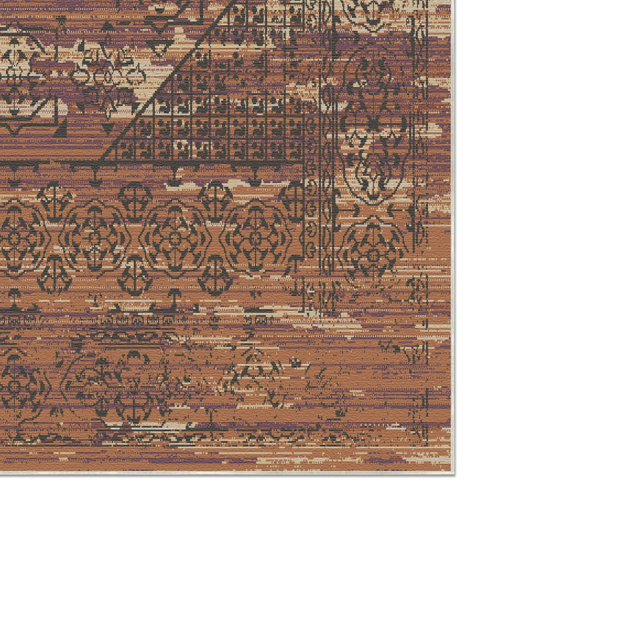 Experience the dramatic allure of a sun-scorched landscape with the Vesper Copperstone Geometric Washable Rug. A daring departure from its ethereal ivory counterpart, this design plunges into a rich, moody palette of burnt orange, deep plum, and charcoal gray. The iconic central geometric medallion and intricate borders remain, but they are now bathed in the warm, smoldering tones of a desert twilight. With its heavy horizontal striations and intentionally weathered finish, the rug possesses a rugged, "relic-like" quality that feels both ancient and sharply modern. It is a peerless choice for adding visual weight and warmth to an industrial loft, a moody executive study, or a contemporary living room that dares to embrace bold, earthy colors.