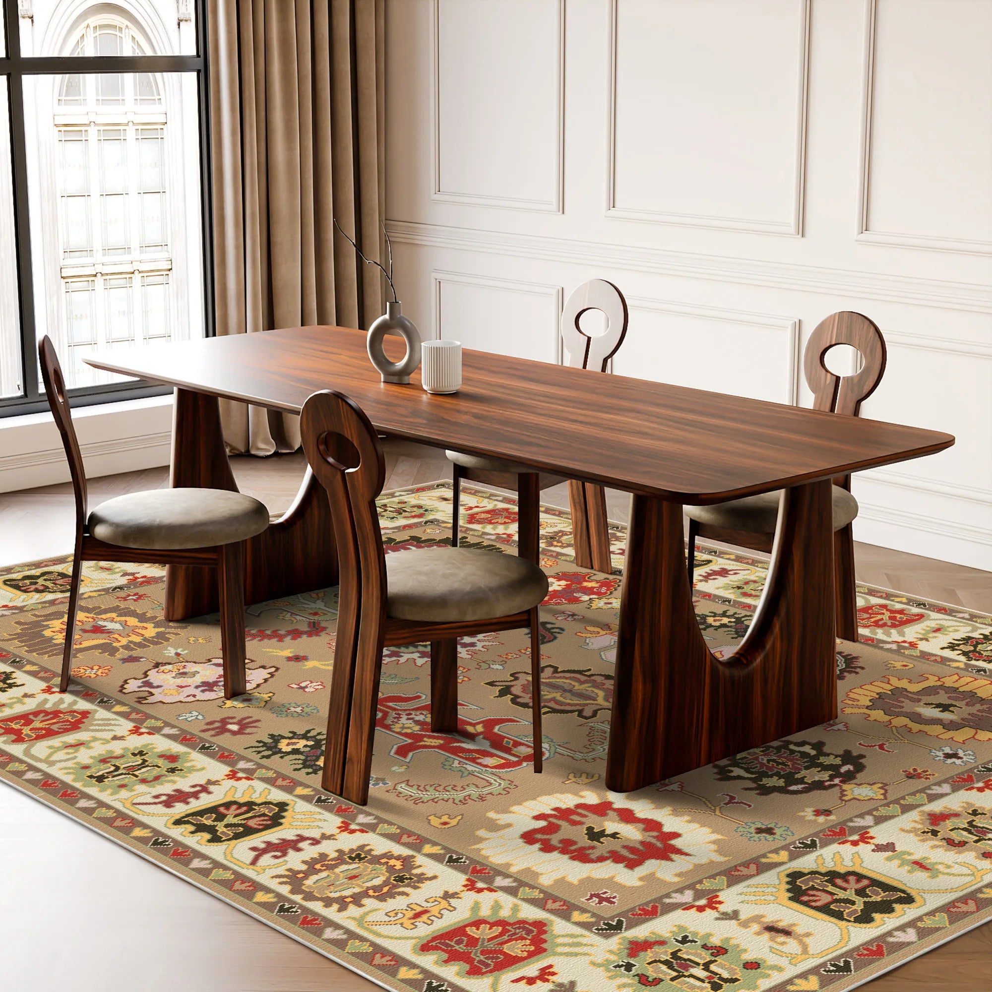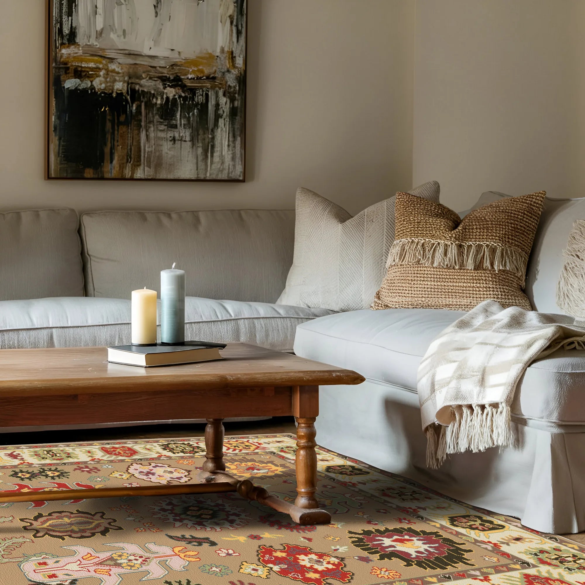 Ground your home in the warm, storied elegance of the Vesta Ochre Totem Washable Rug, a piece that artfully bridges the gap between nomadic folk art and contemporary rustic design. This rug features a captivating array of scattered "totem" medallions, stylized floral icons, and ancient protective symbols, each rendered with high-definition clarity. The field is a rich, earthen canvas of vizon and ochre taba, providing a soulful foundation for the deep burgundy, forest green, and mustard accents that breathe life into the motifs. Framed by an ornate, cream-based border featuring a rhythmic sequence of arrowhead and botanical guards, this rug acts as a visual storyteller, making it a peerless choice for a cozy den, a high-contrast farmhouse kitchen, or a creative studio space seeking an authentic, curated vibe.
