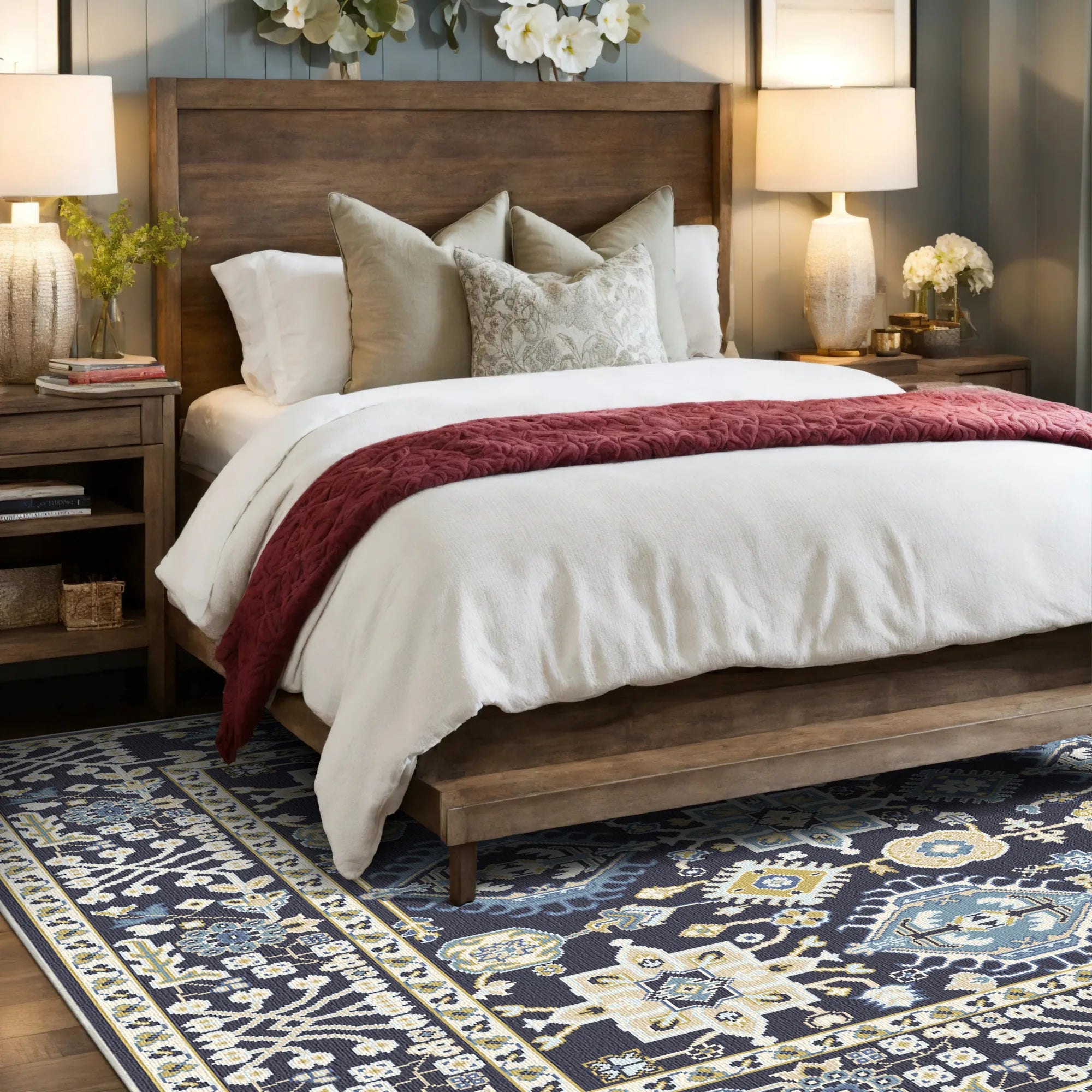 Masterfully engineered for the demands of an evolving home, the Vortex Obsidian Zenith is woven from premium, high-density polyester fibers that deliver a velvety, cloud-like touch underfoot while offering superior resilience. The dark, multi-tonal base is an expert practical choice, naturally masking daily shadows and pet activity, while our advanced color-lock technology ensures the crystalline blue and ivory highlights remain brilliant through years of use. For ultimate safety, it features a high-grade, integrated slip-resistant backing that grips firmly to your hardwood or tile floors, ensuring the rug remains perfectly flat without the need for additional pads. Fully machine washable and optimized for robot vacuum compatibility, this rug brings the timeless essence of artisan craftsmanship into your home with the ultimate ease of maintenance.