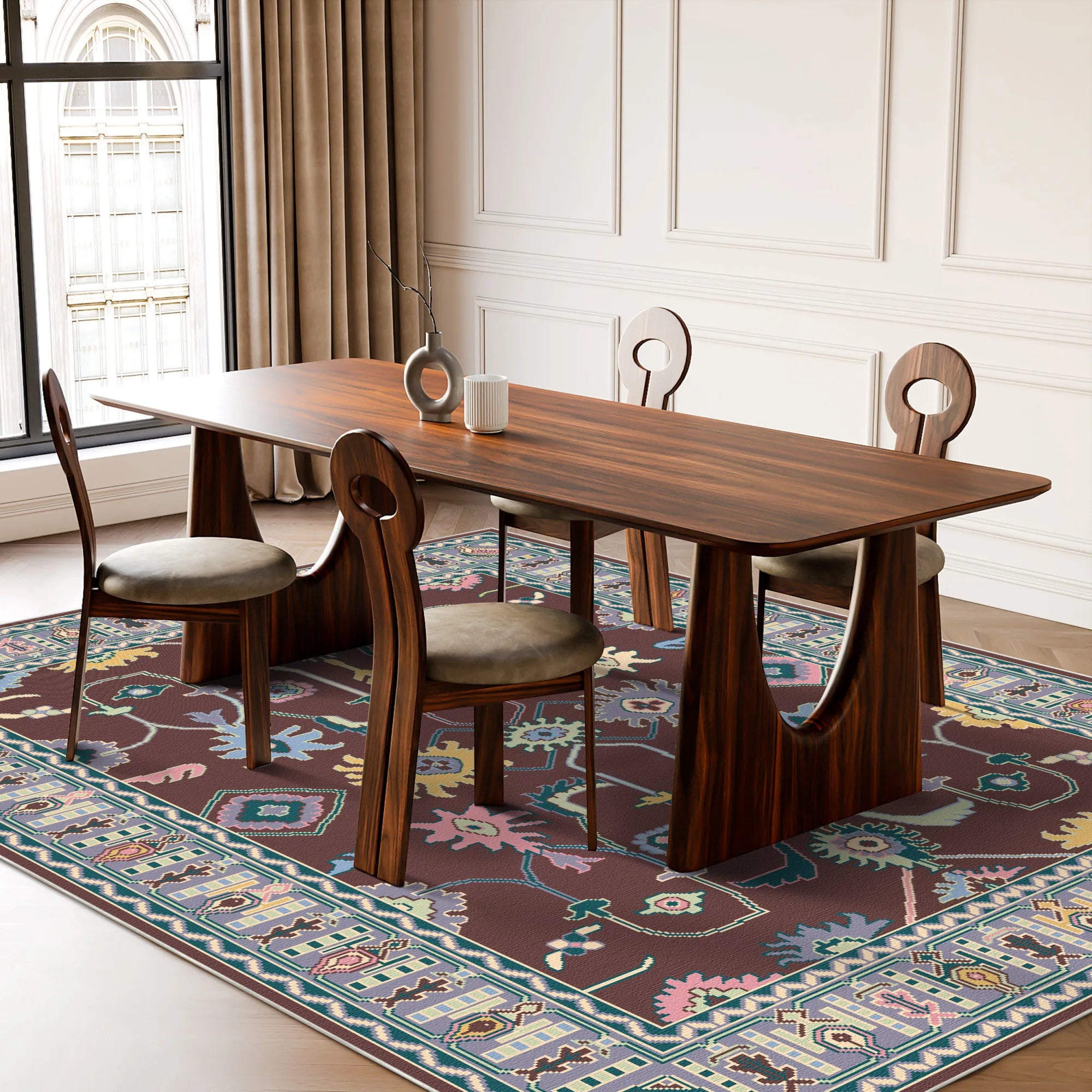 Ground your sanctuary with the soulful depth and rhythmic artistry of the Vortex Plum Mystic Totem Washable Rug. This design is a masterclass in symmetrical storytelling, featuring a central axis of reaching botanical totems and mirrored tribal emblems that evoke the quiet majesty of a midnight orchard. The field is a deep, velvety plum espresso, providing a rich and light-absorbing foundation that allows the high-definition motifs in sky blue, buttery yellow, and soft rose to pop with a gentle, luminescent glow. Every element, from the stylized central blossoms to the delicate scrolling vines, is carefully balanced to create a sense of meditative order. Framed by an exceptionally detailed, multi-layered border with rhythmic geometric guards and soft lavender accents, this rug is a peerless choice for a cozy reading nook, a sophisticated dining room, or a primary suite that demands a warm, historical anchor with a modern twist.