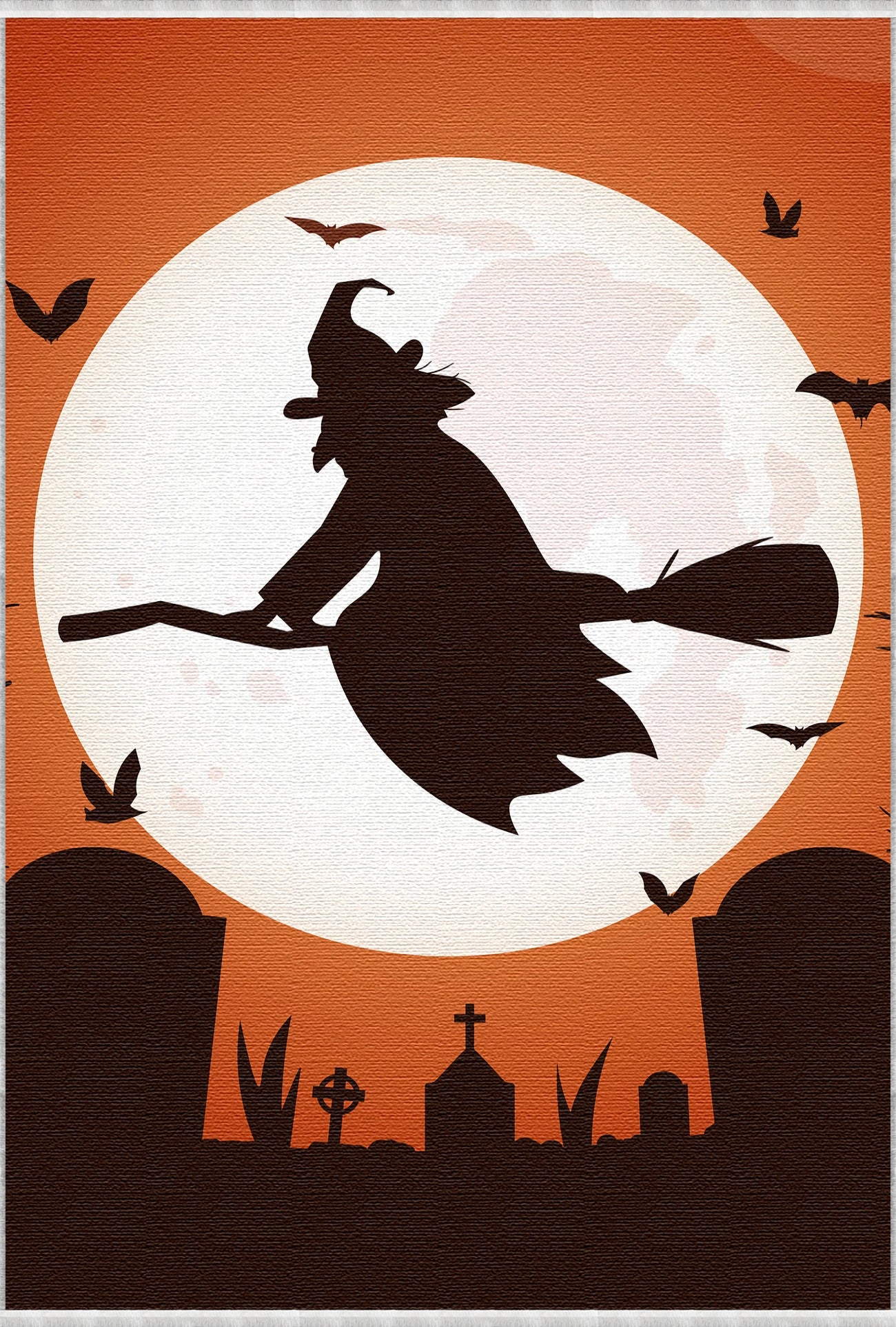 Capture the quintessential spirit of Halloween night with this visually striking area rug. The design features a bold, classic silhouette of a witch flying on a broomstick across a massive, hauntingly bright full moon against an orange twilight sky. The bottom border completes the eerie scene with silhouettes of graveyards and tombstones. This highly dramatic and graphic pattern instantly sets a mystical and spooky tone for the holiday season. Made from durable polyester with a comfortable 8mm pile height and supported by a stable cotton backing, this rug is both stylish and practical. Best of all, it is fully washable for easy maintenance after the spooky festivities conclude.